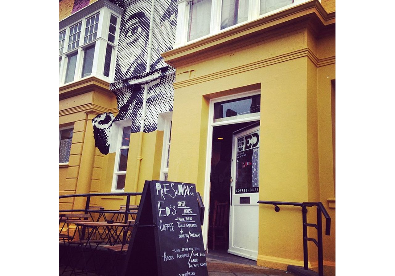 Presuming Ed (Brighton): Lovingly crafted Coffee; killer cake; sanwiches (toasted to perfection); gigs; events; parties (day/night); artwork; bitcoin; stimulating conversation; meeting rooms for hire; work stations for students; dogs welcome...